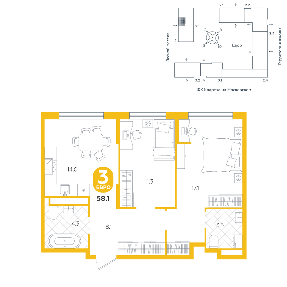 2-комнатная, 58.1 м²