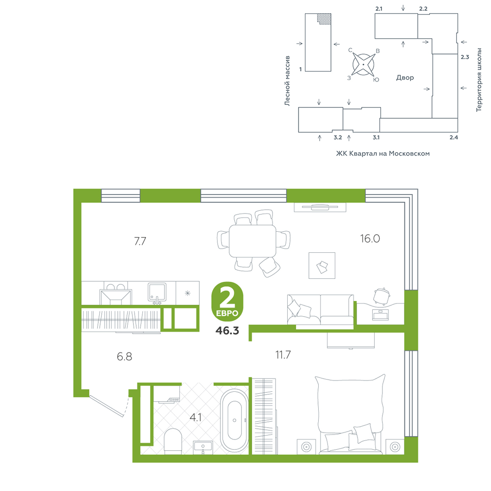 2-комнатная, 46.3 м²
