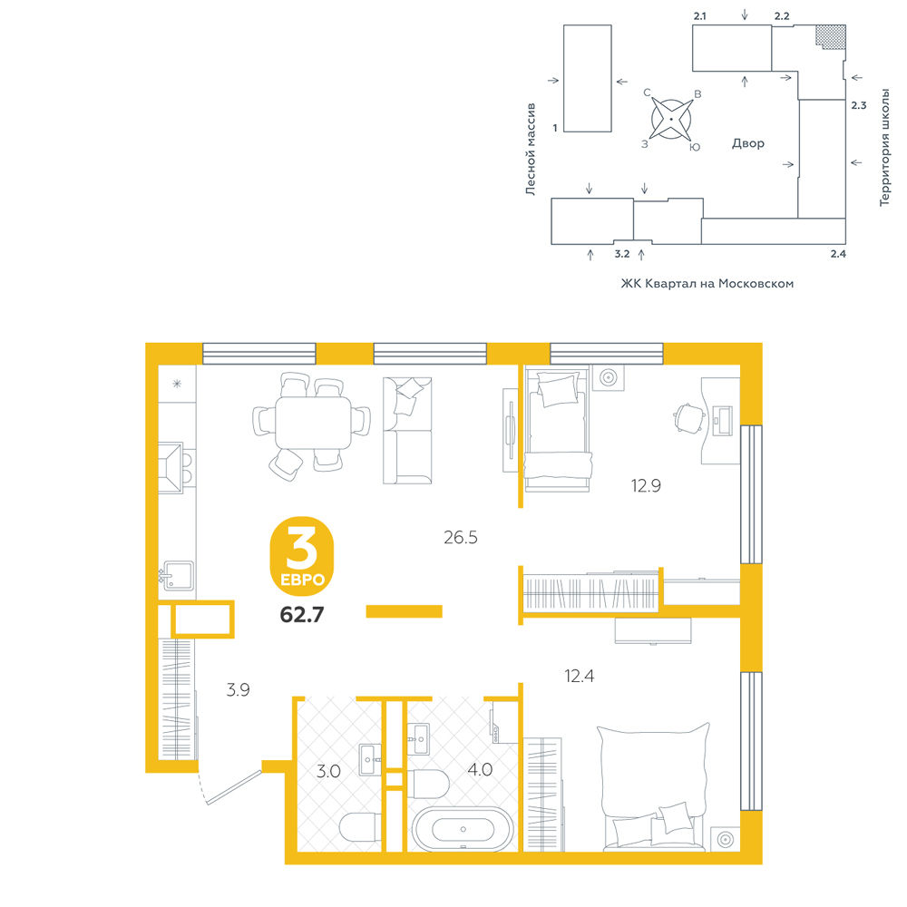 3-комнатная, 62.7 м²