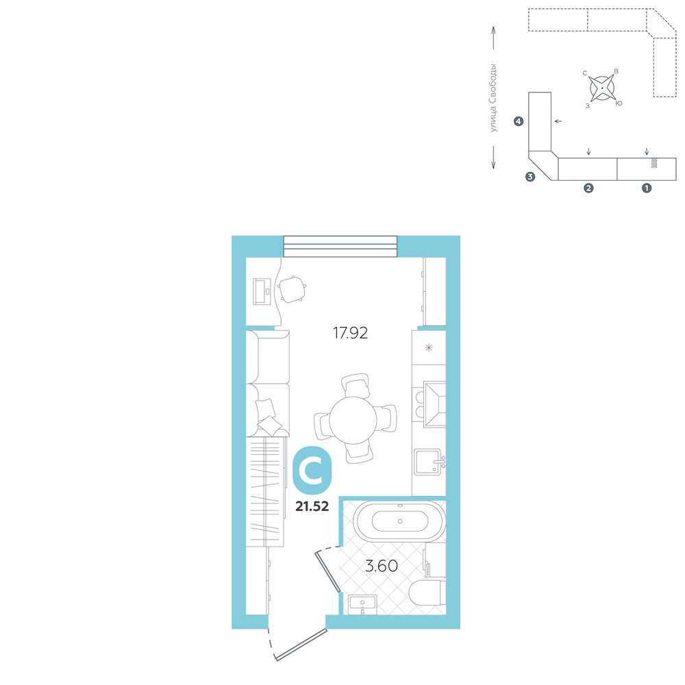 Студия, 21.5 м²