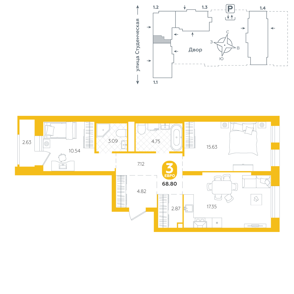 2-комнатная, 68.8 м²
