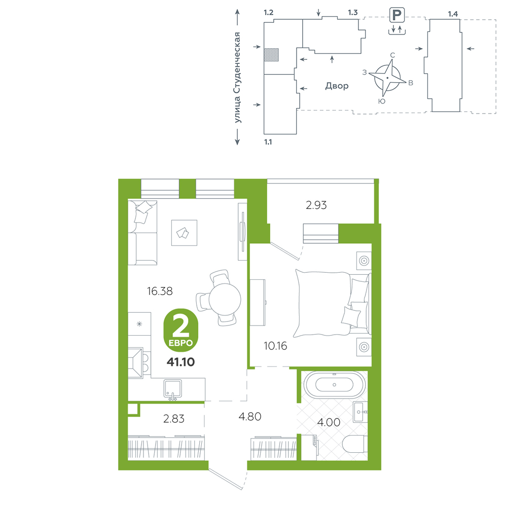 1-комнатная, 41.1 м²