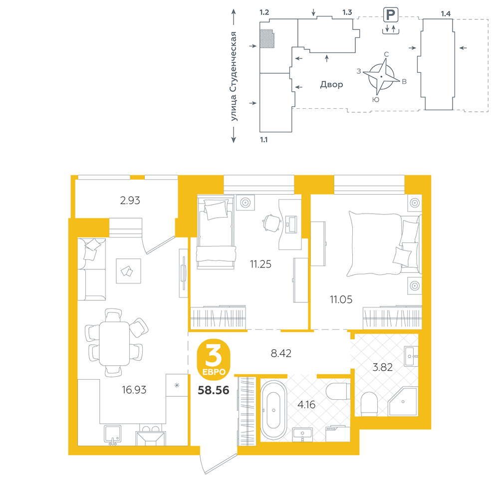 2-комнатная, 58.6 м²