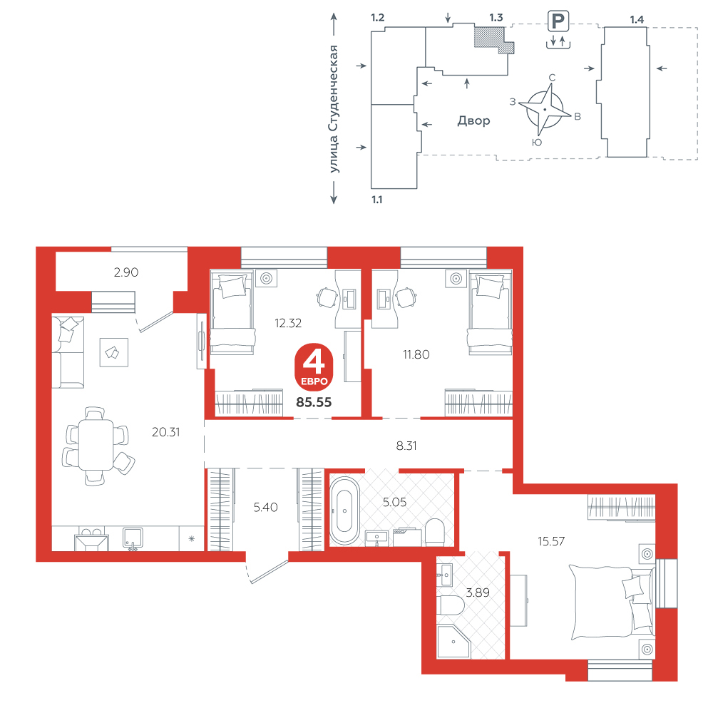 3-комнатная, 85.5 м²