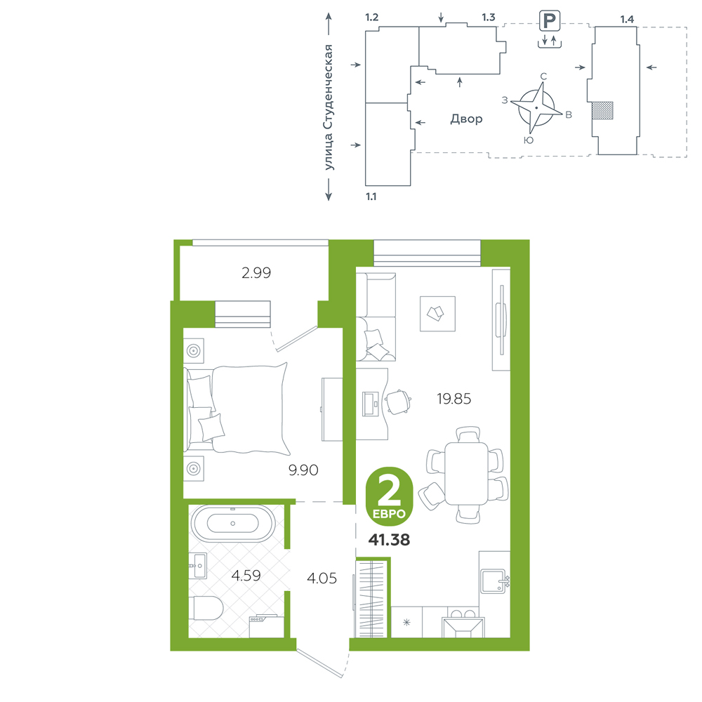 1-комнатная, 39.4 м²