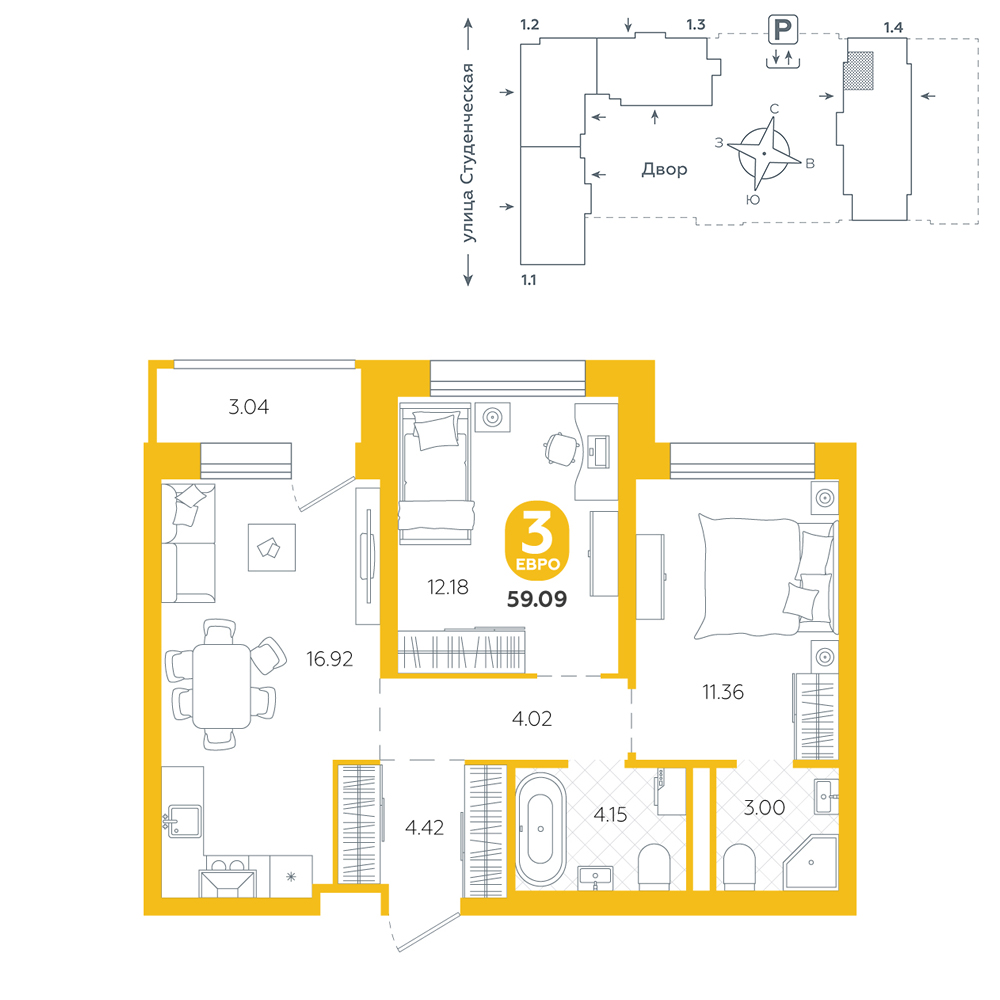 2-комнатная, 59.1 м²