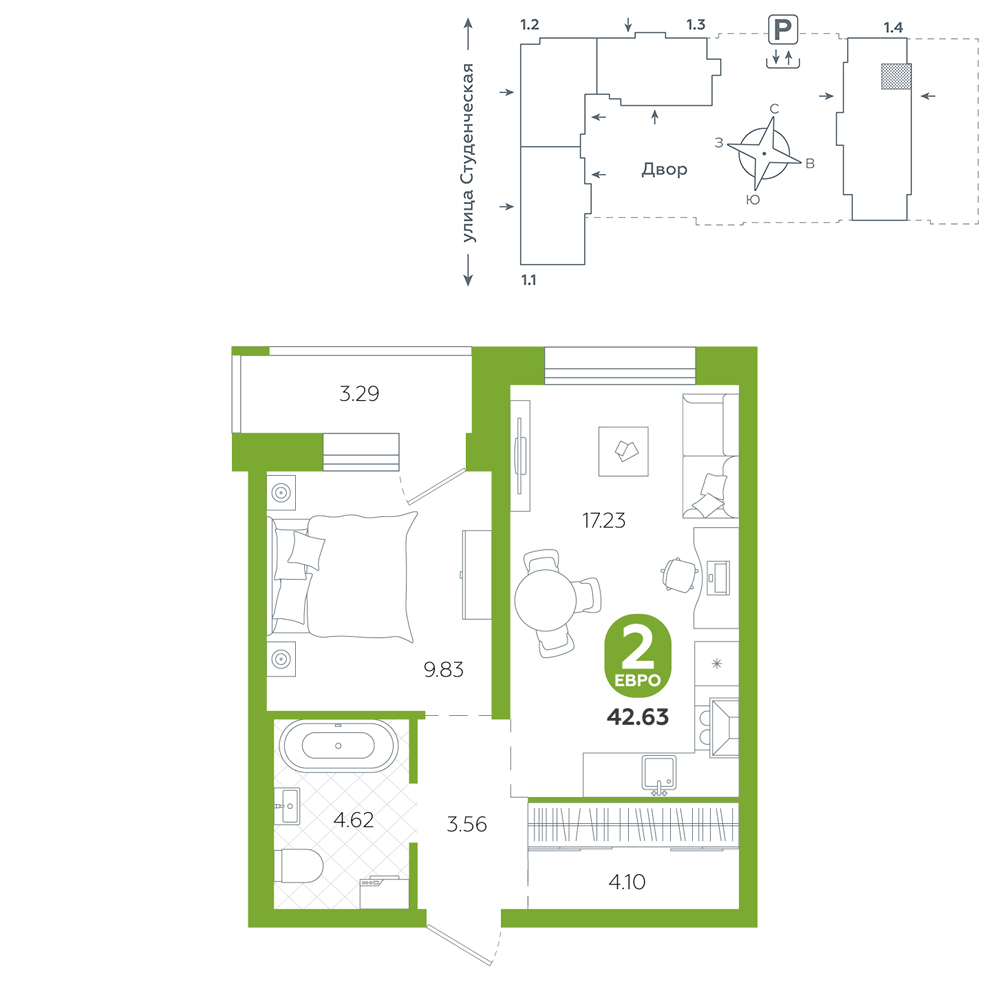 1-комнатная, 42.6 м²