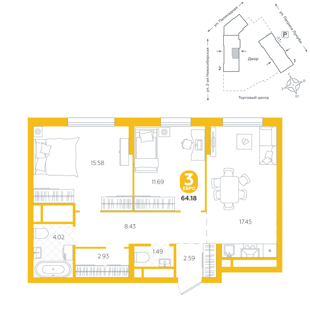 2-комнатная, 64.2 м²