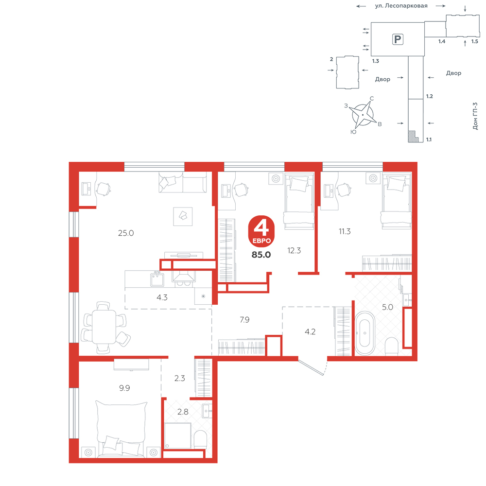 4-комнатная, 85 м²