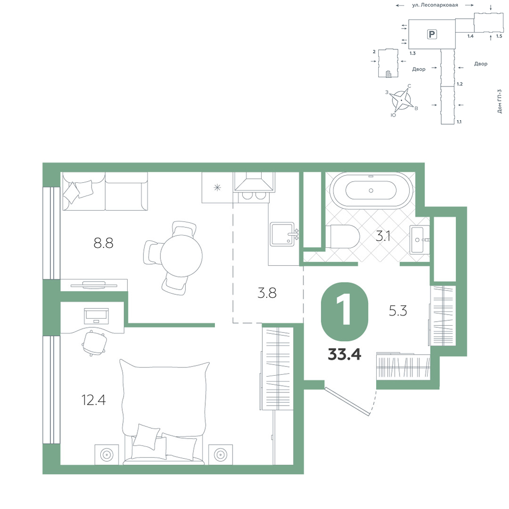 1-комнатная, 33.4 м²