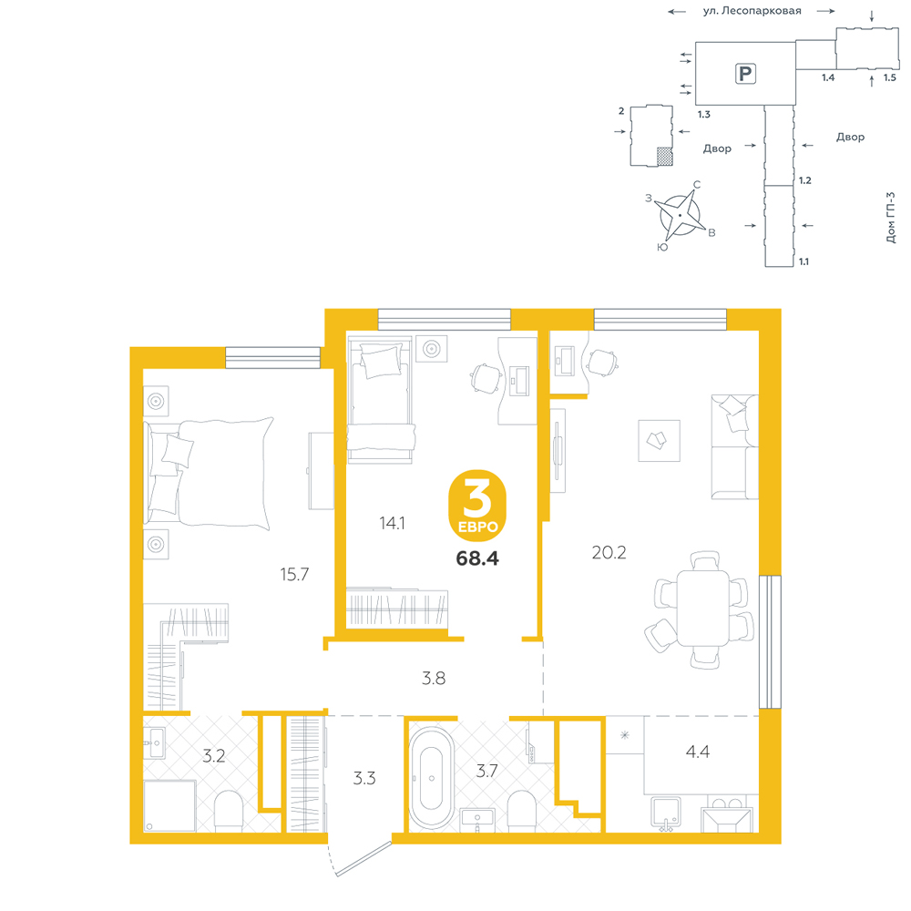 3-комнатная, 68.4 м²