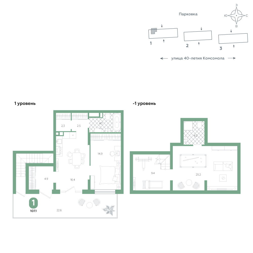1-комнатная, 107.1 м²