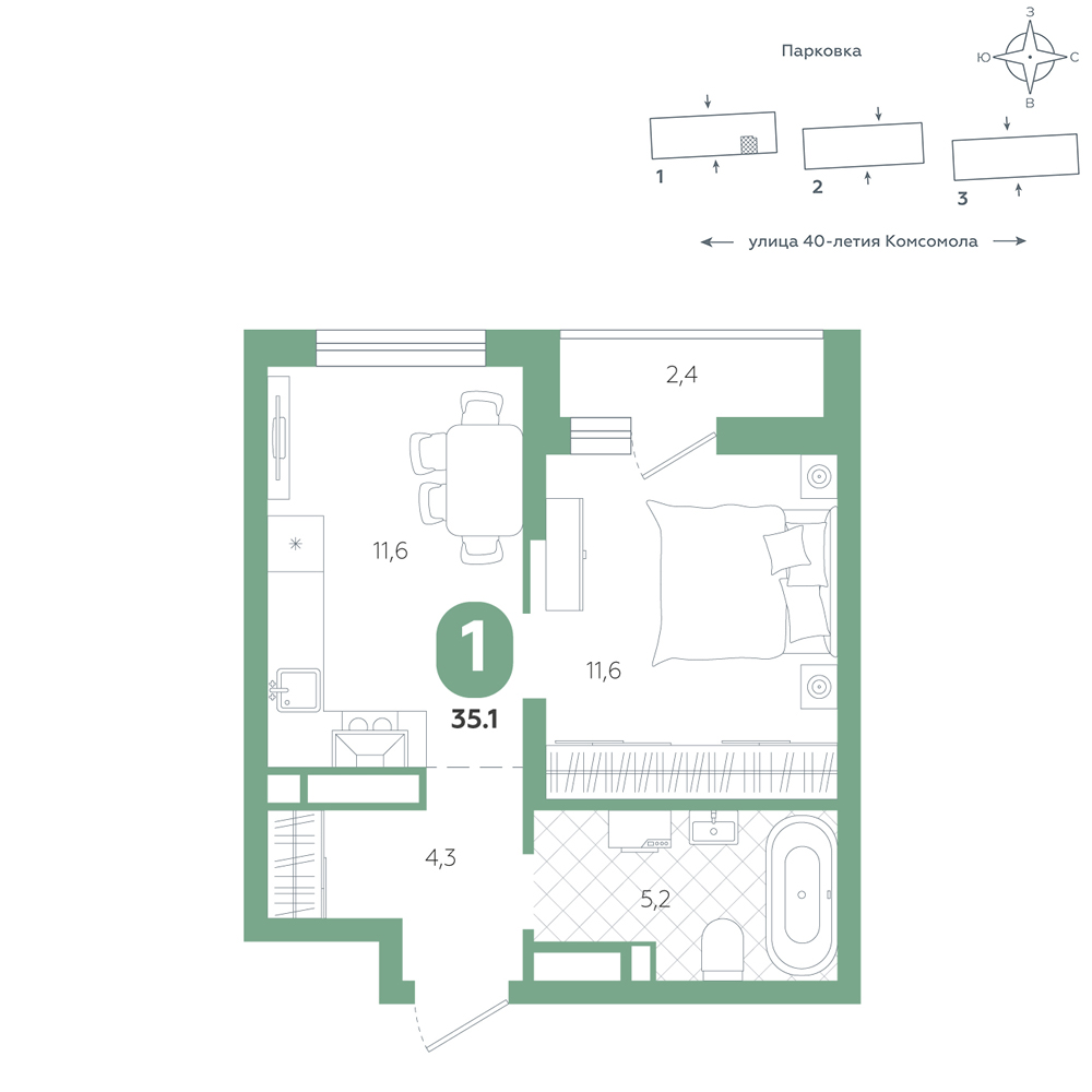 1-комнатная, 35.1 м²