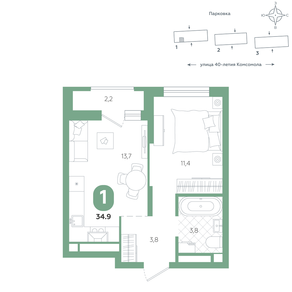 1-комнатная, 34.9 м²