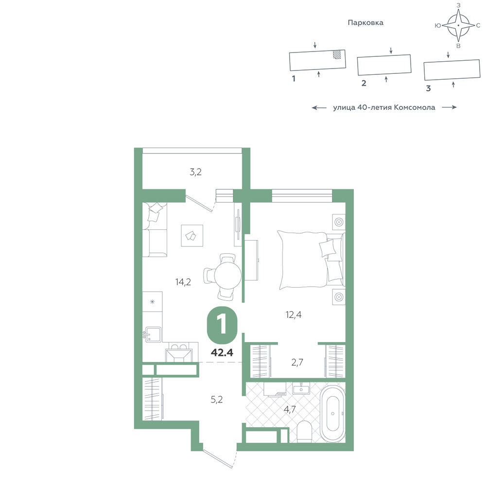 1-комнатная, 42.4 м²