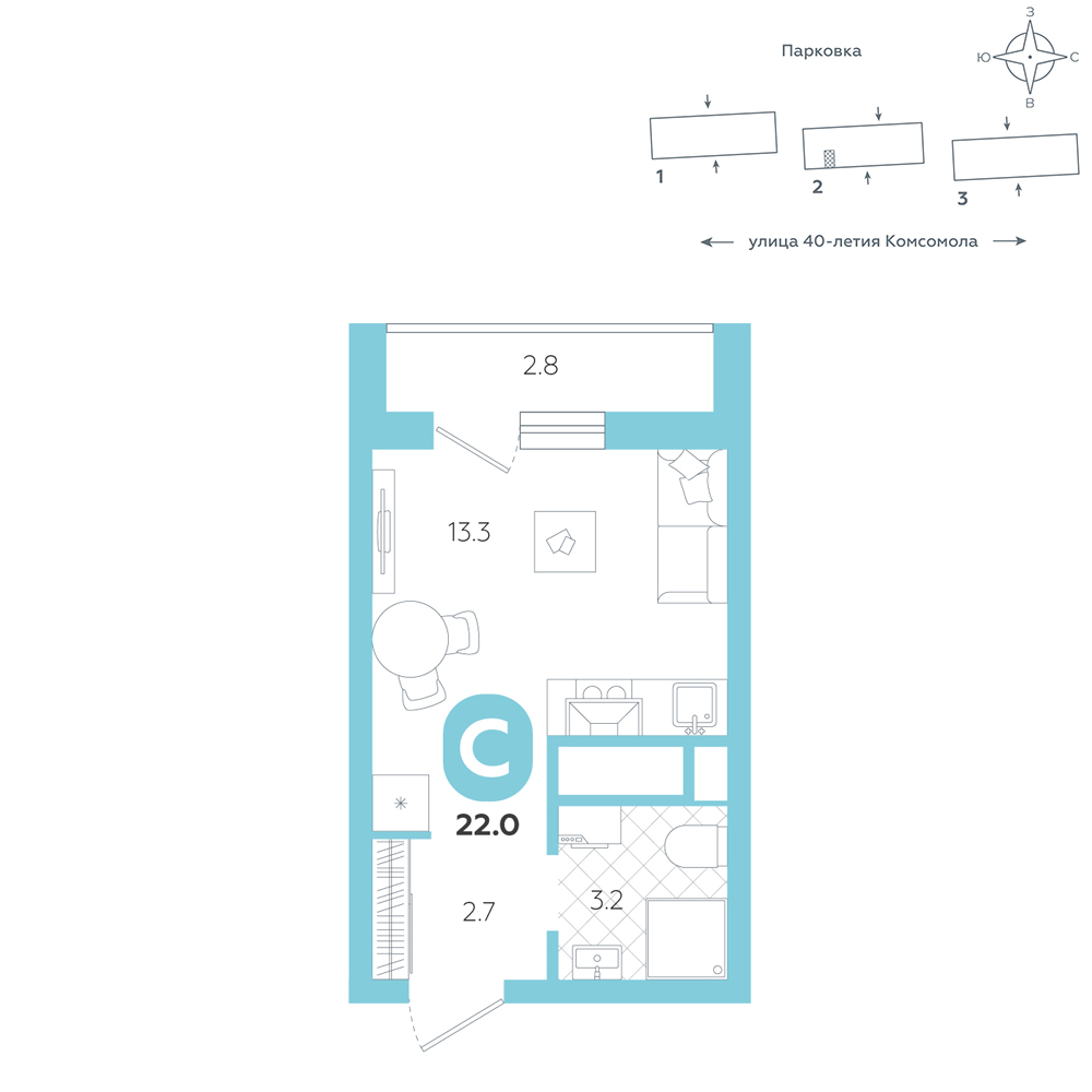 Студия, 21.9 м²