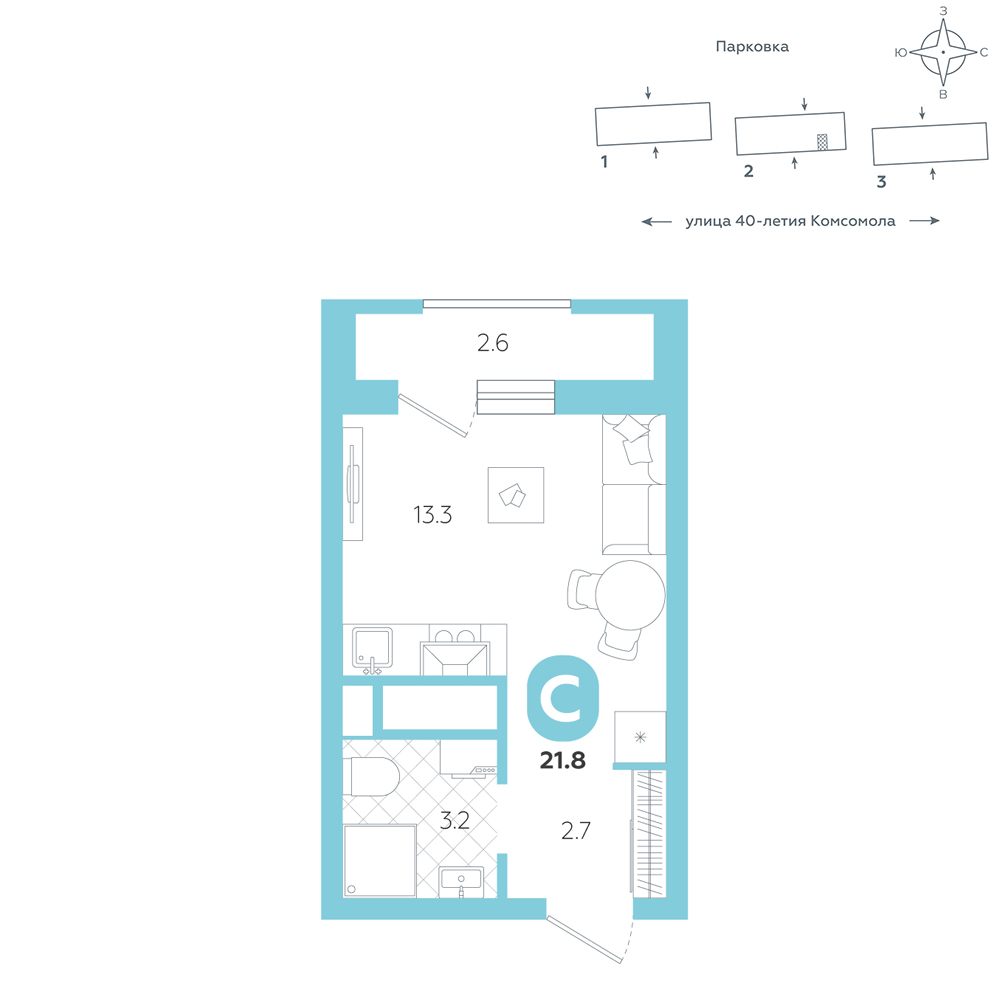Студия, 21.8 м²
