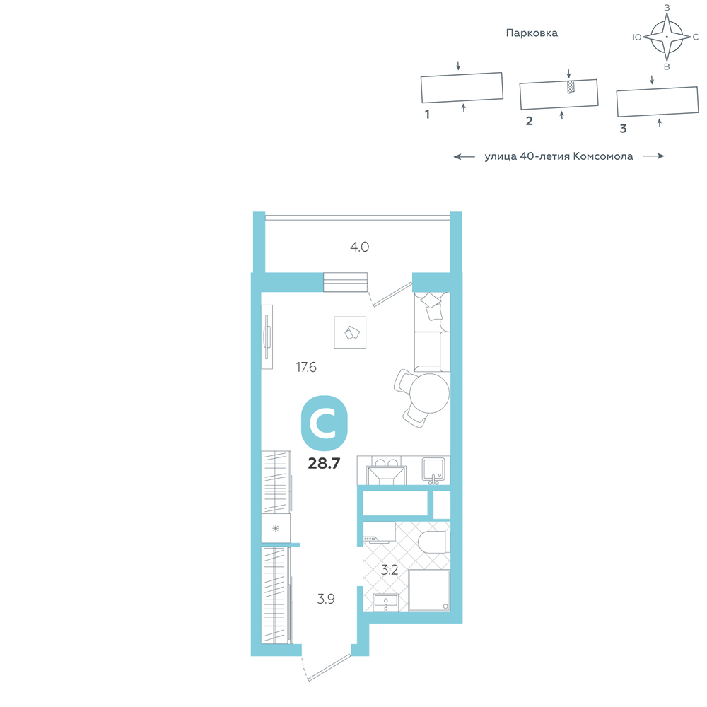 Студия, 28.7 м²