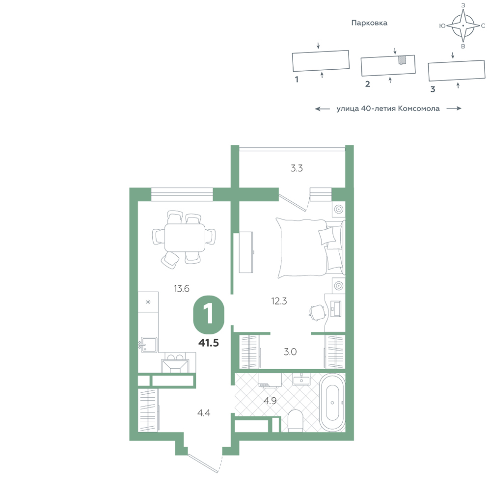 1-комнатная, 41.5 м²
