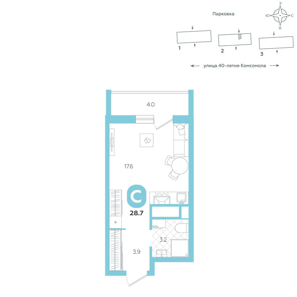 Студия, 28.7 м²