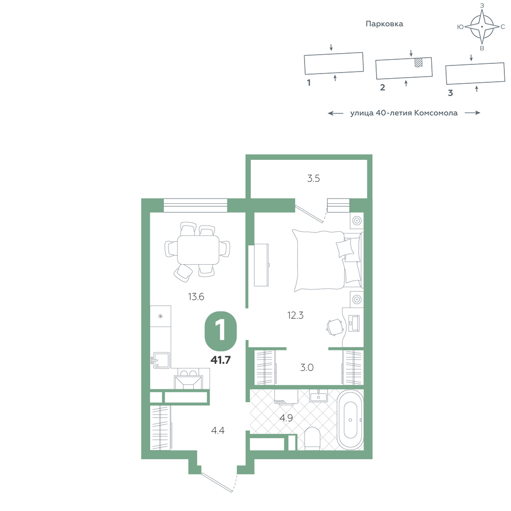 1-комнатная, 41.7 м²