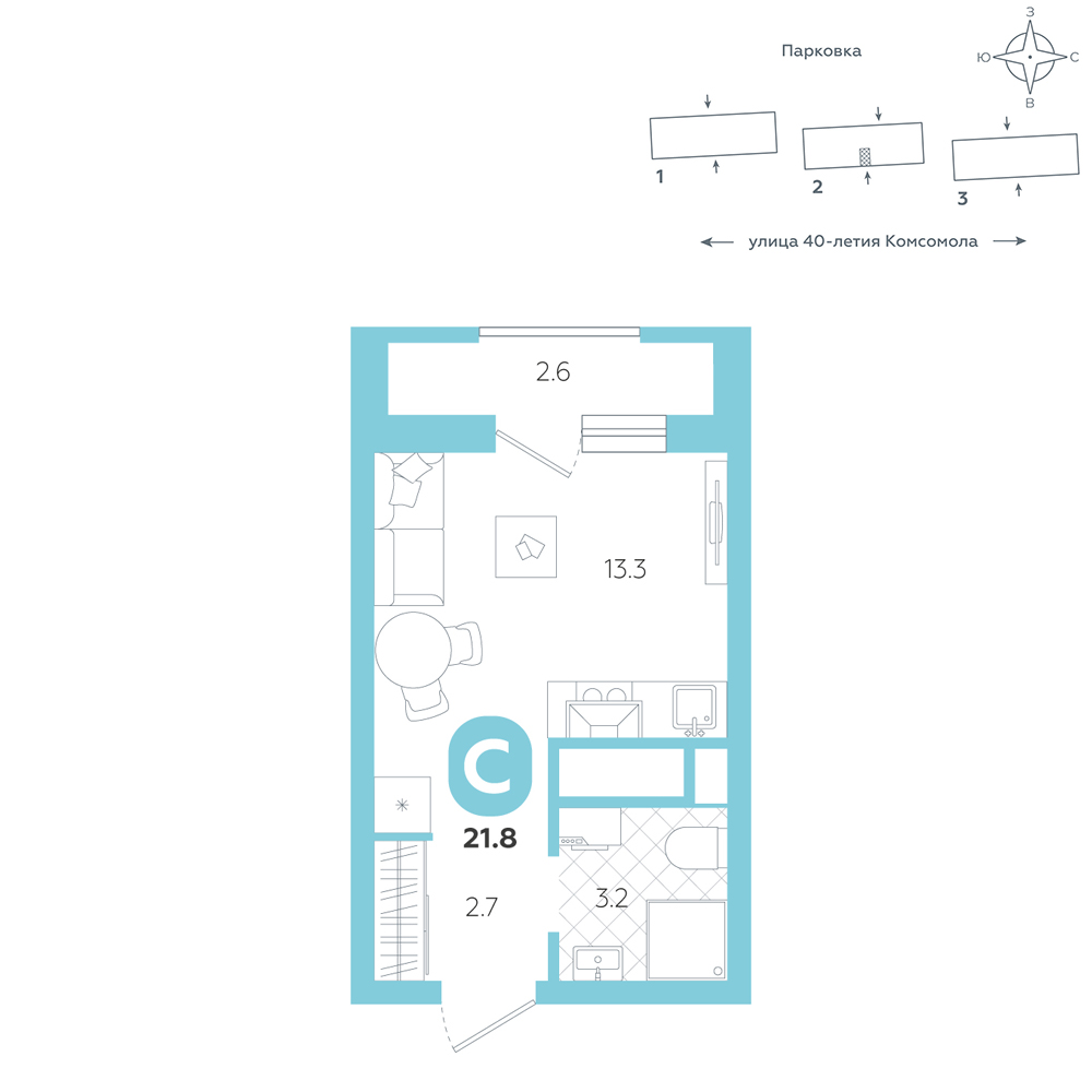 Студия, 21.8 м²