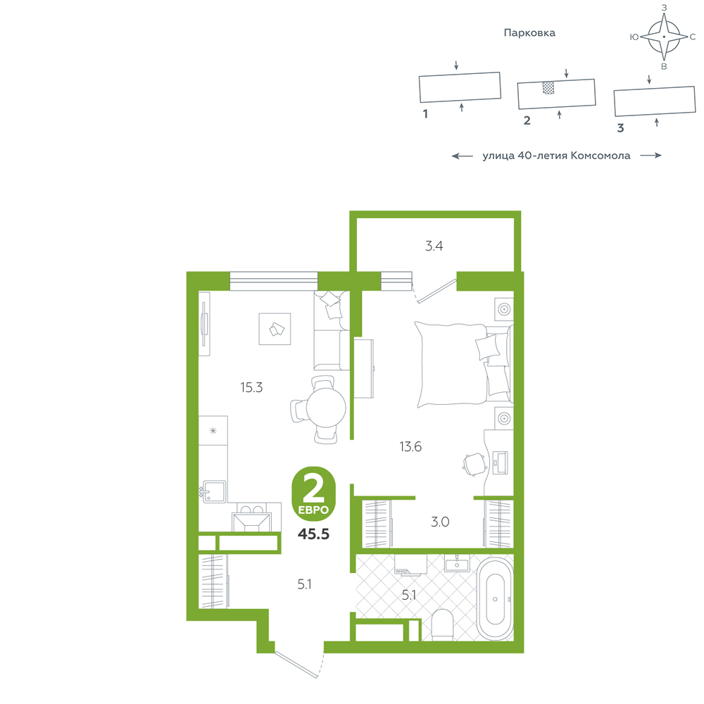 1-комнатная, 45.5 м²