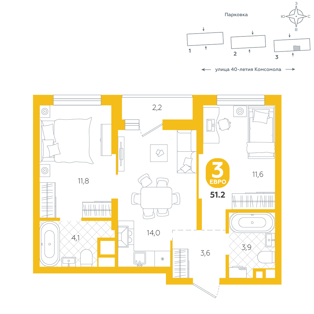2-комнатная, 51.4 м²
