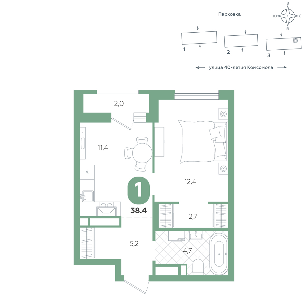 1-комнатная, 38.4 м²