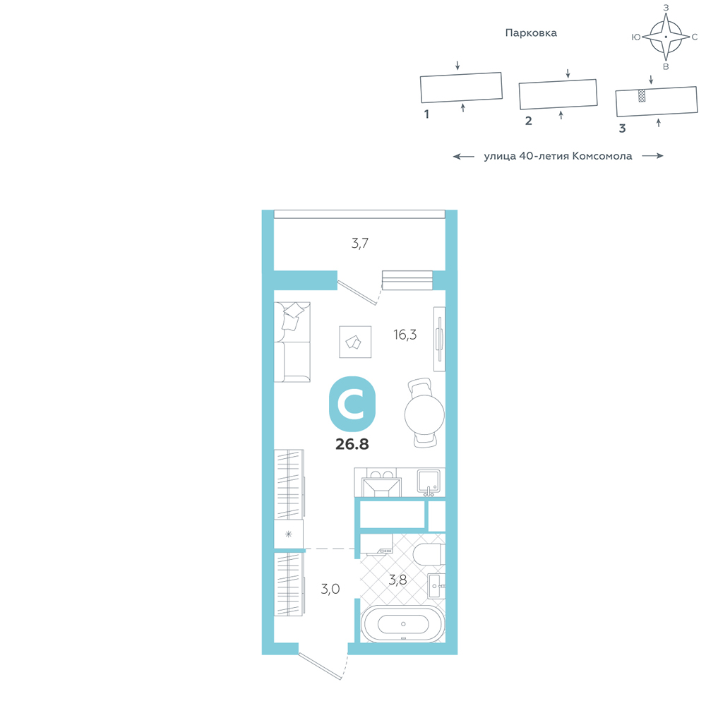 Студия, 26.8 м²