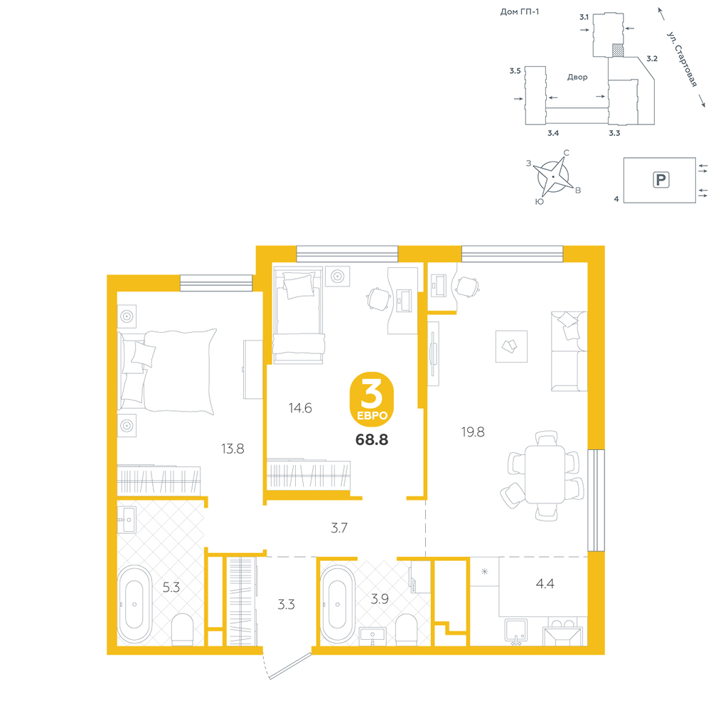3-комнатная, 68.8 м²