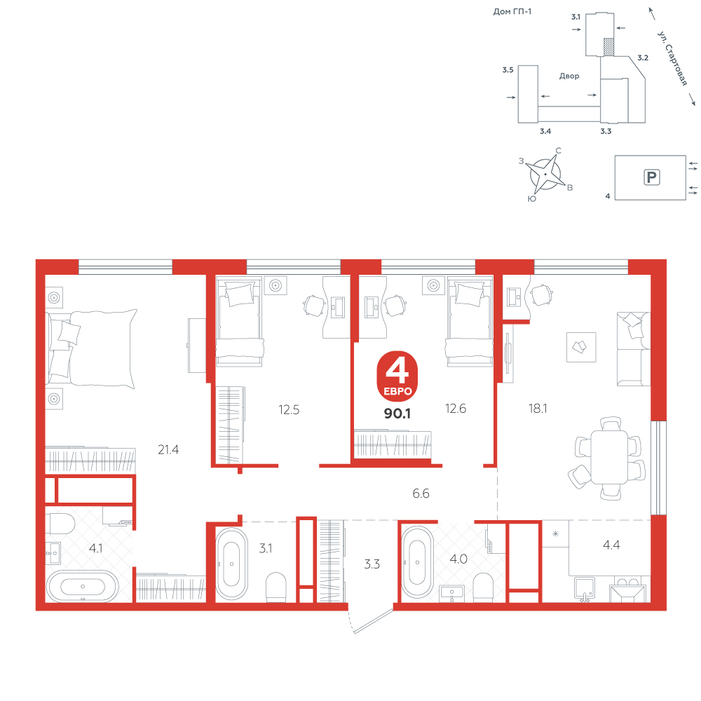 4-комнатная, 90.1 м²