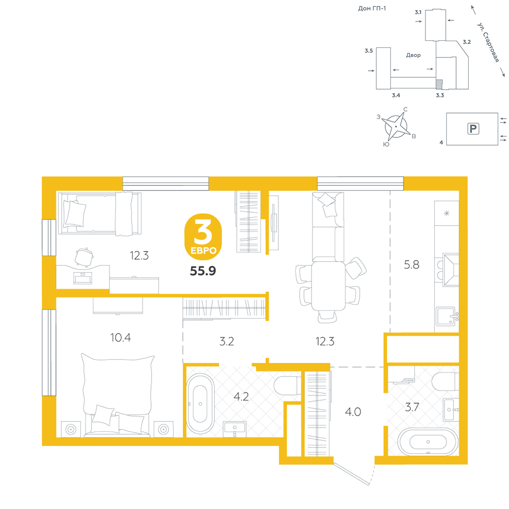 3-комнатная, 55.9 м²