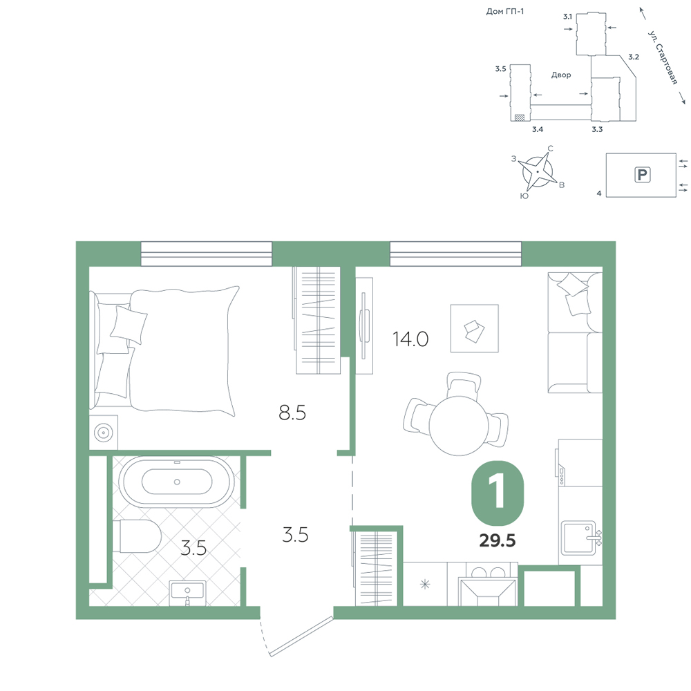 1-комнатная, 29.5 м²