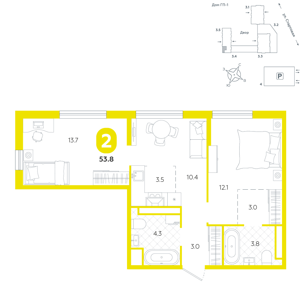 2-комнатная, 53.8 м²