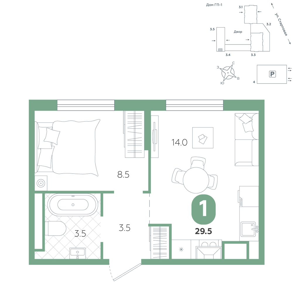 1-комнатная, 29.5 м²