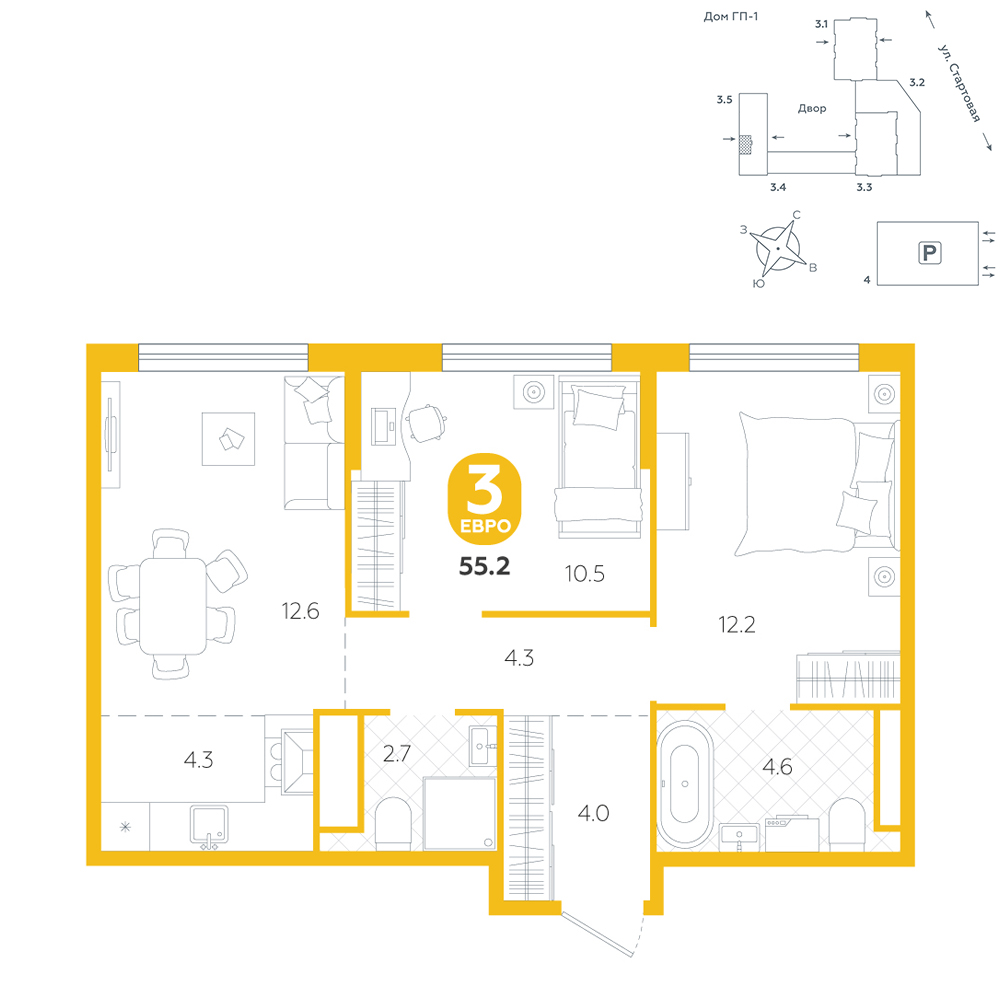 3-комнатная, 55.2 м²